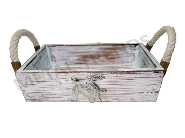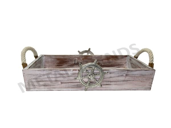 WOOD TRAY WITH SHIP WHEEL & ROOP HANDLE Size: 18″ X 9″ X 3″